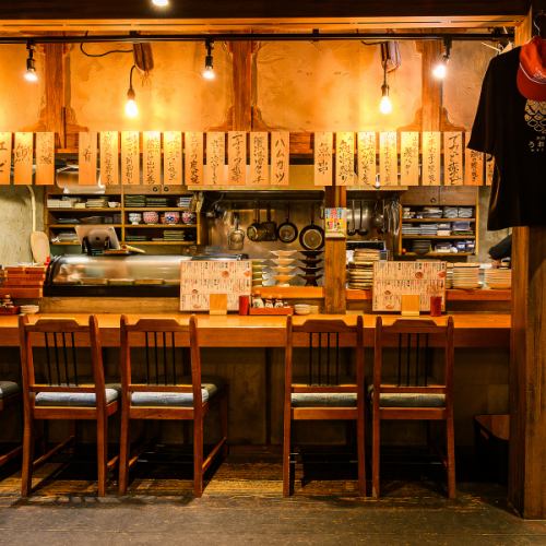 お一人様でのふらっと立ち寄りや、少人数での会話を楽しむのに最適なカウンター席をご用意しています。目の前で職人が腕を振るう活気ある雰囲気を感じながら、ゆったりとお酒を嗜めます。デートでの利用も、二人の距離がぐっと縮まる上質な空間です!木の質感を生かした温もりある席で、大人の時間を満喫してください♪